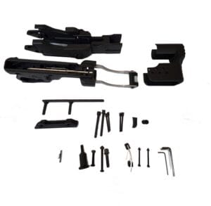 The kit includes the polymer chassis, mounting system, cheekrest, flat/curved front trigger shoes, adjustable buttpad module, laser-cut 5052 aluminum 1911-style trigger assembly, rear safety elimination plug, both temporary and hardened hardware packs, and tools.